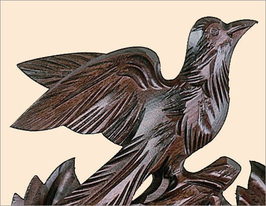 This handcrafted Schneider cuckoo clock displays the high quality craftsmanship characteristic of the Schneider clock company. Made in the Black Forest region of Germany, this beautiful cuckoo clock has a mahogany finish and features extra deep carving of birds and tree leaves. Every detail on this clock is handcrafted and made from real Black Forest linden wood. Decorative metal pinecones serve as counterweights to the strikes and cuckoo calls that come on both half and full hours. This beautiful cuckoo clock is truly a work of art and can make a great addition to your home or collection.